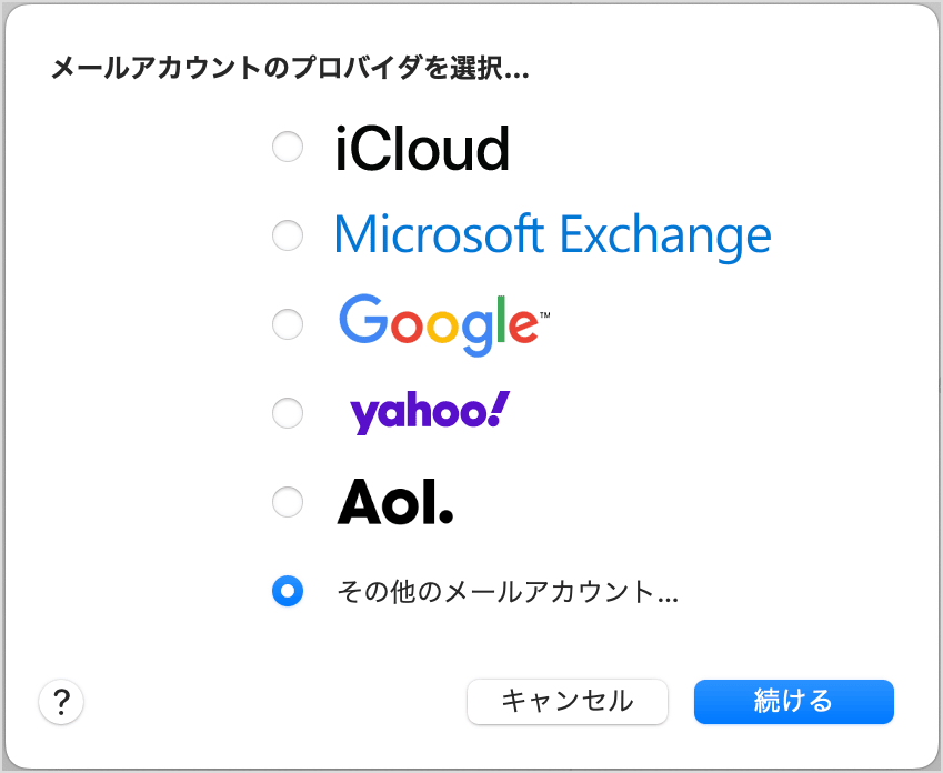 - ロリポップ!で作成したメールアドレスを設定する場合「その他のメールアカウント...」にチェックを入れて「続ける」ボタンをクリックします。