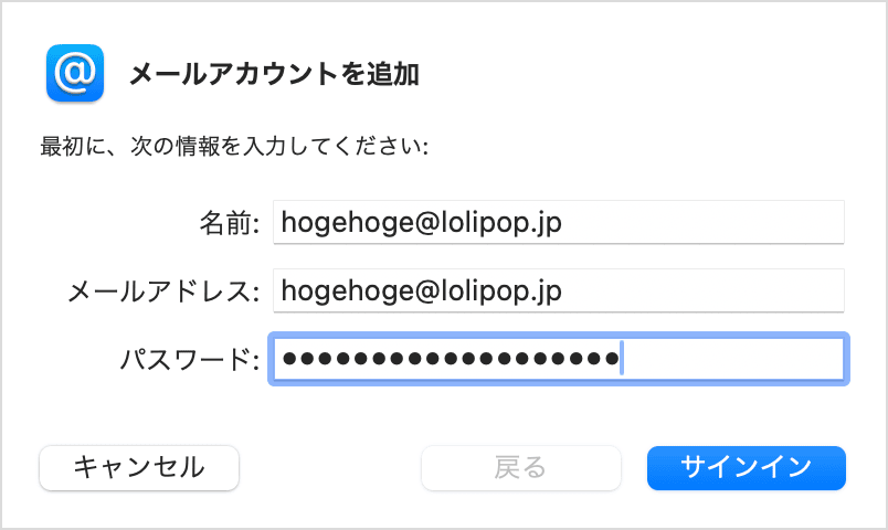 - お客様のお名前、メールアドレスとメールパスワードを入力し、「サインイン」ボタンをクリックします。