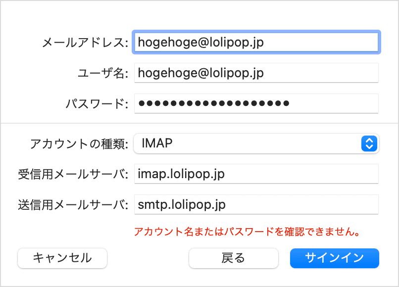 - 自動で情報確認できないため、「アカウント名またはパスワードを確認できません。」というエラーが表示されます。各項目のメールアカウント情報を手動で入力し、「サインイン」ボタンをクリックします。